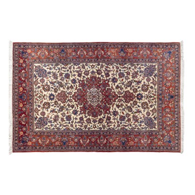 Esta exquisita alfombra Isfahan, tejida con una combinación de lana y seda, refleja la maestría artesanal de la legendaria ciudad persa. Su diseño refinado, con patrones intrincados y colores vibrantes, destaca por su suavidad, brillo y detalle excepcional.