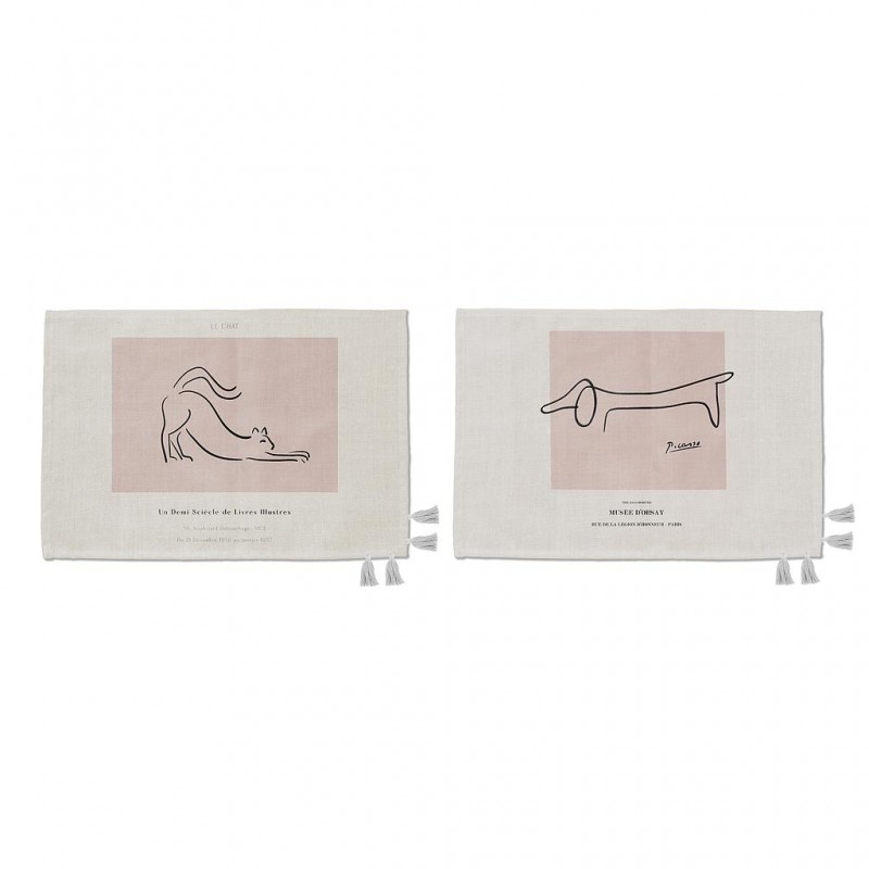 Set of 2 placemats made in panama fabric with anti-stain treatment, printed with UV-resistant and respectful inks. Topped with trimmings tassels. Wash maximum 40Cº. 100% waterproof polyester. Do not use bleach. Low temperature dryer. Low temperature ironing. Do not dry clean. Sustainable product all materials and processes have been manufactured in Spain