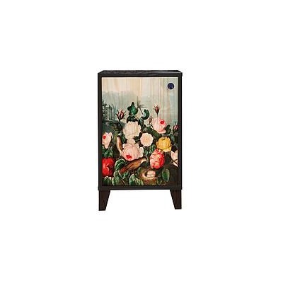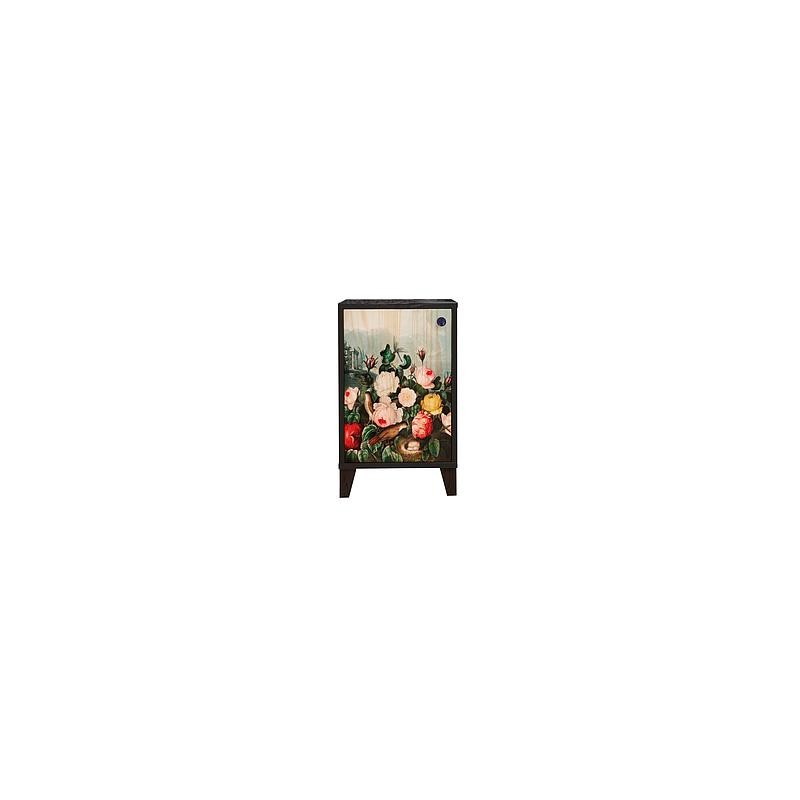Mesita fabricada en madera de pino maciza, alistonada sin nudos de 15mm. Estampado y tiradores metálicos dorados. Patas fabricadas en madera. Se sirve con las patas desmontadas, de fácil montaje. Fabricado en España.