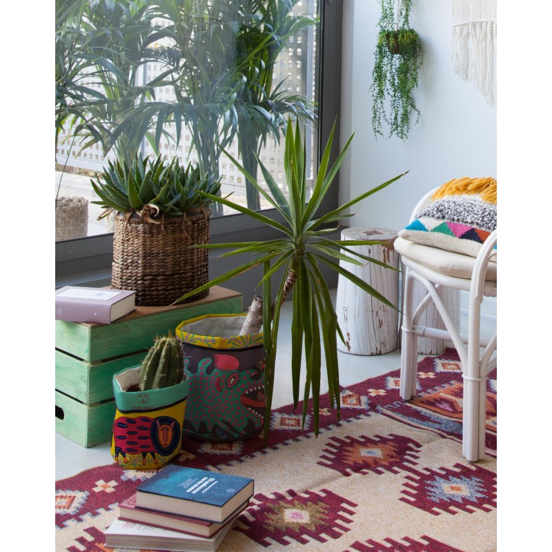 Basket made of high quality teflon textile resistant to light and washing. Ideal for use as a pot cover. Wash at 30ºC. Do not use Bleach. It can be washed by hand. Do not tumble dry. Iron to a point. Small bag size: diameter 19 cm, height 22 cm. Large bag size: diameter 27 cm, height 30 cm. Made in Spain.