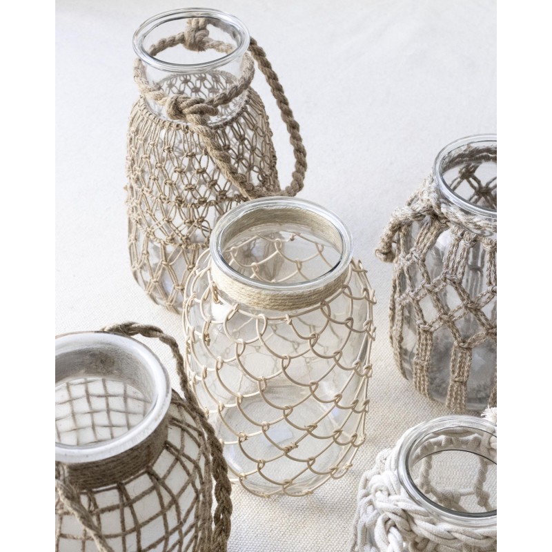 Jarra de vidrio decorada con fibra de yute artesanal. Fabricado en India.