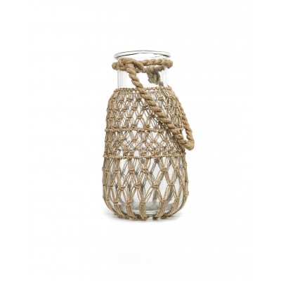 Jarra de vidrio, decorada en fibra de yute artesanal. Fabricado en India.