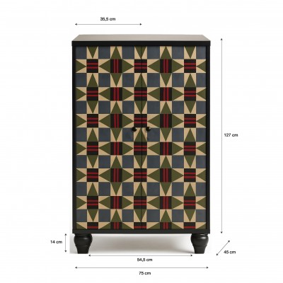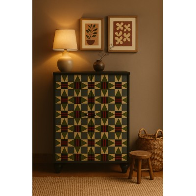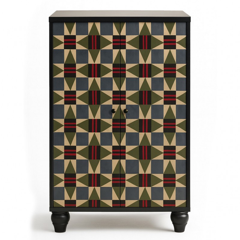 Su frontal se viste con un patrón geométrico hipnótico, de inspiración textil tradicional, reinterpretado en una paleta profunda: verde oliva, azul grafito, rojo quemado y tonos arena. U