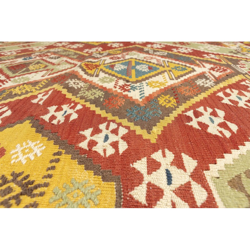 Ce tapis Kilim extrafine, tissé à la main en Turquie avec 100% laine, est un chef-d'œuvre de l'art textile anatoly.