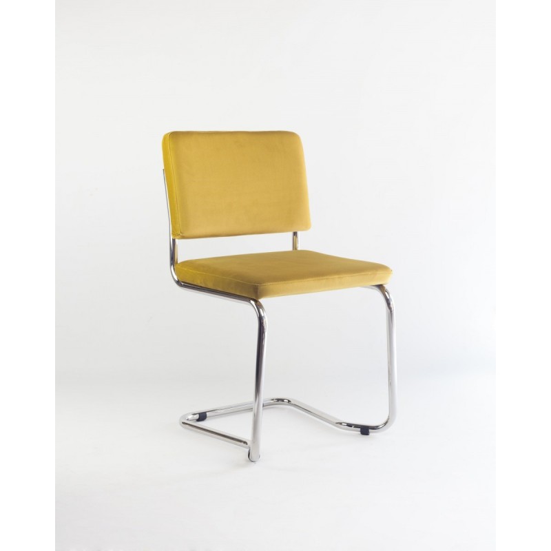 Chaise à structure métallique chromée de profil en acier de tube de 25 mm de diamètre et 2 mm d'épaisseur. Haute résistance élastique. Siège et dossier rembourrés en velours. Base de siège et support de planche en contreplaqué de chêne.