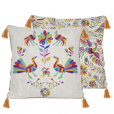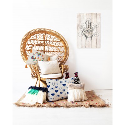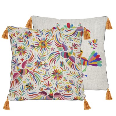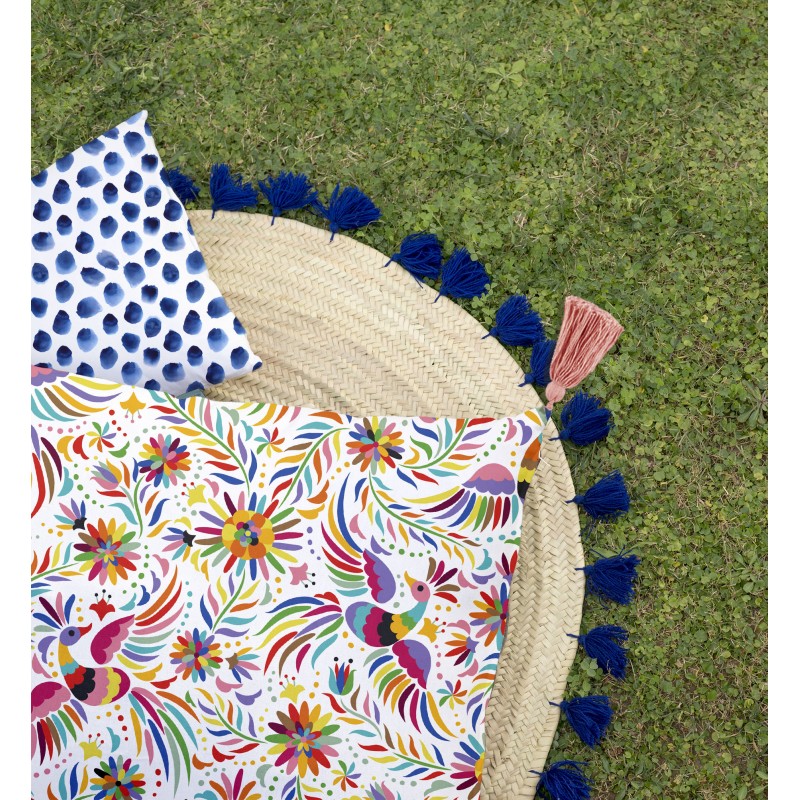 Decorative cushion in patterned linen topped with decorative tassels. Includes hypoallergenic filling and anti-mite treatment. Removable for easy washing. 15% Linen 85% Machine washable Pol up to 30º. 45 x 45 cm. Made in Spain.