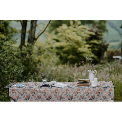 Mantel de 140x140. Lavar a máquina a max. 30°C. No utilizar lejía. No utilizar secadora. Planchar a temperatura baja. No limpiar en seco. Fabricado en España.