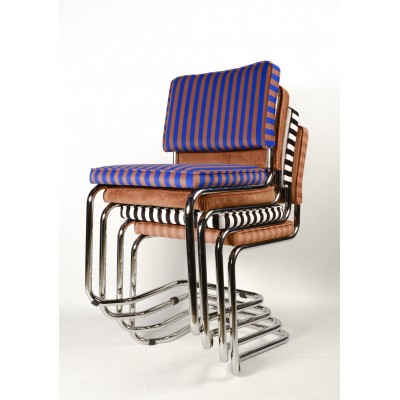 La structure métallique apporte stabilité et résistance, tandis que l’assise et le dossier rembourrés assurent un grand confort, même en cas d’utilisation prolongée. Idéale pour les salles à manger, bureaux, salles de réunion ou projets d’architecture intérieure à la recherche de caractère sans renoncer à la fonctionnalité.
